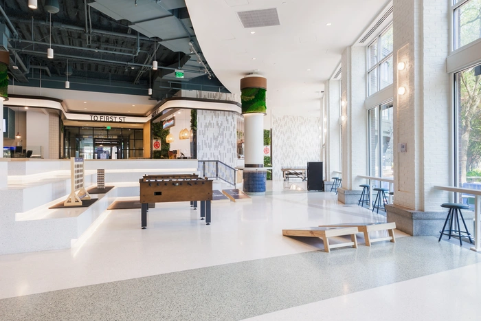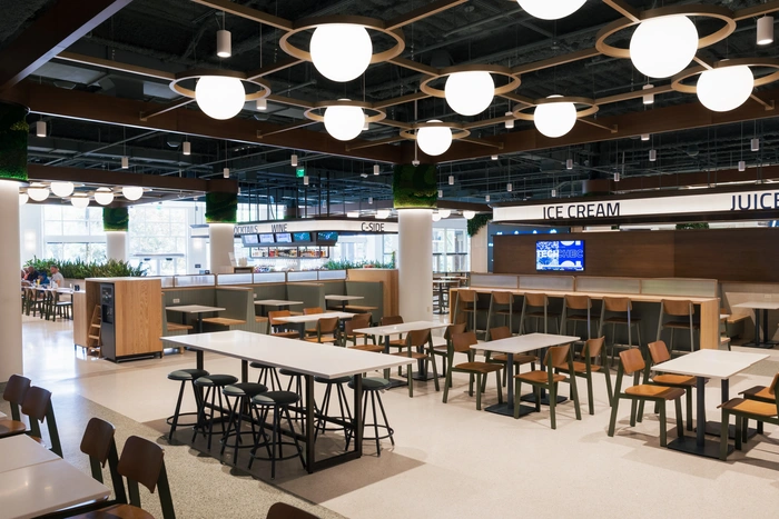 Semi-private seating areas along the food hall perimeter, set apart by built-in booths. TVs available for entertainment or branding purposes.