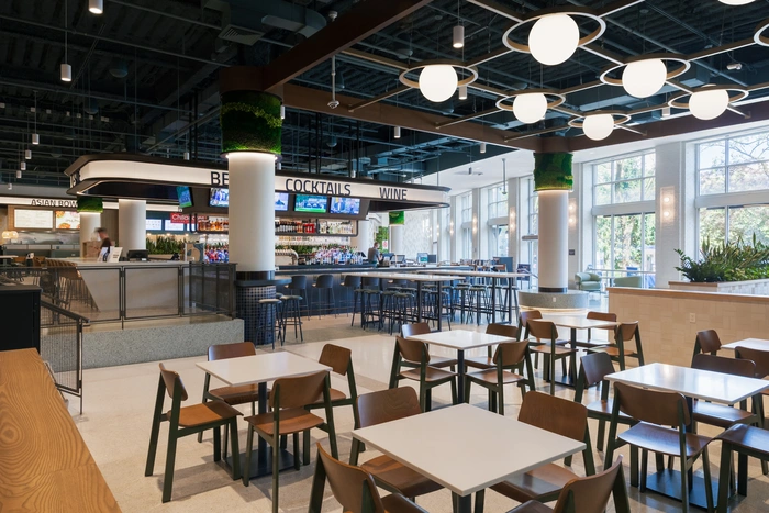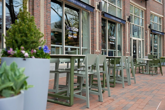 Outdoor setting overlooking the canal and park. Connects to the food hall with a fresh and local vibe.